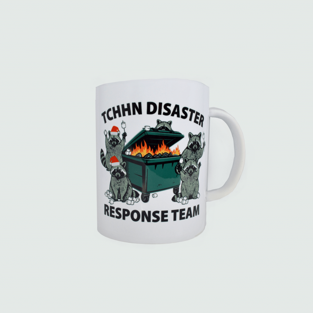 The goal was to create a memorable gift that reflected the fast-paced, problem-solving world of IT. The result was a playful “disaster response team” design. The illustration features raccoons working at computers in a chaotic scene, with the phrase “everything is fine.” While the full-wrap design featured the same humorous illustration across the set, each mug was personalized, creating a unique gift for every team member.