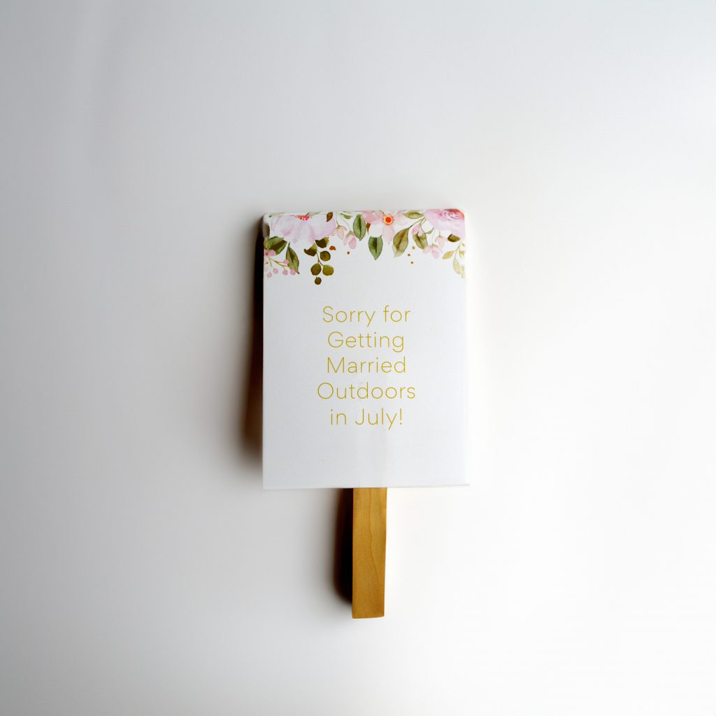 At an outdoor event in July guests can wilt under the heat. One bride and groom wanted a creative way to let guests who attended their summer wedding know they were appreciated. The invites had already been designed and mailed so any additional printed pieces needed to match the existing art.