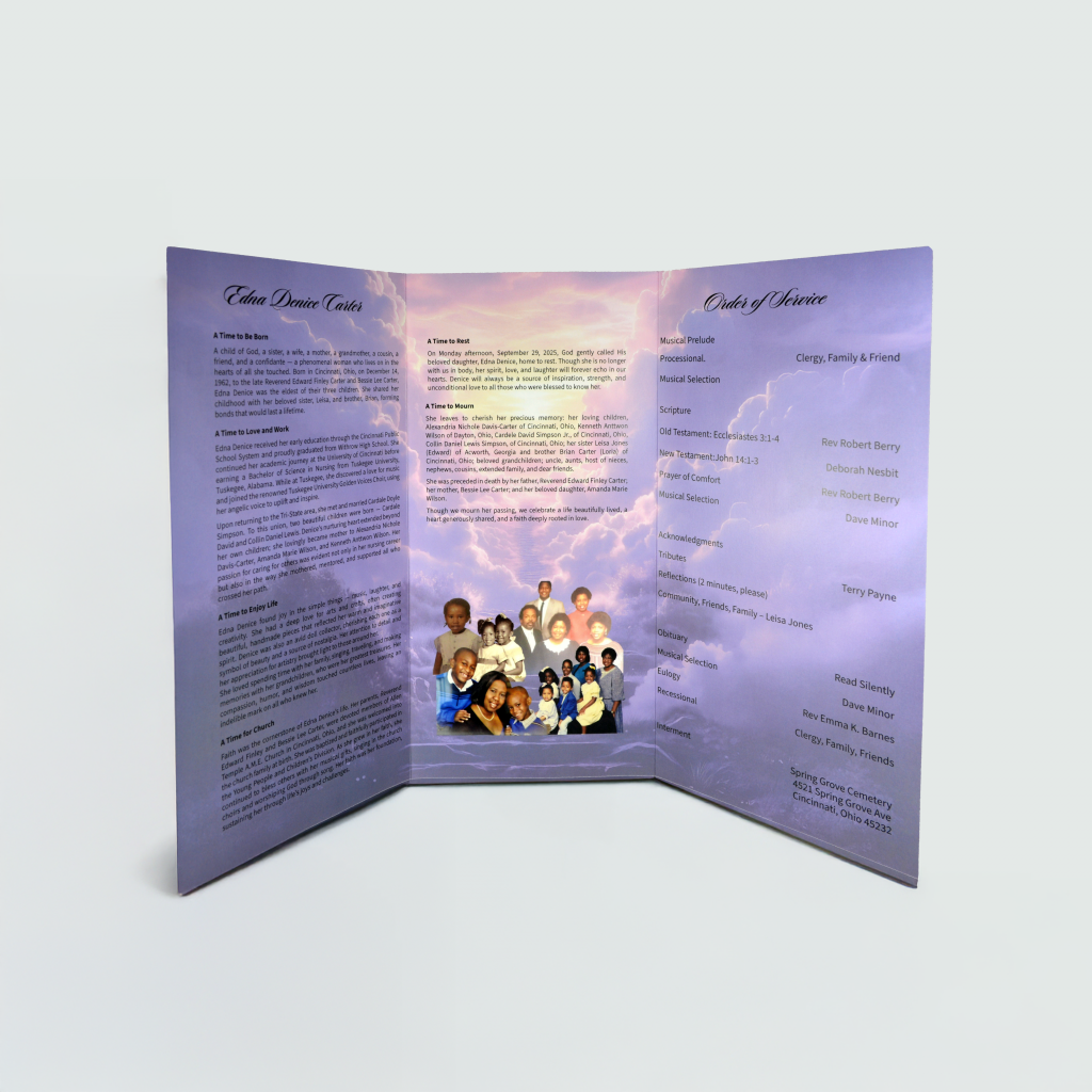The result was an 11 x 17 trifold program designed as a commemorative piece. The format provided space for photos, service details, and personal tributes in a clean, organized layout.