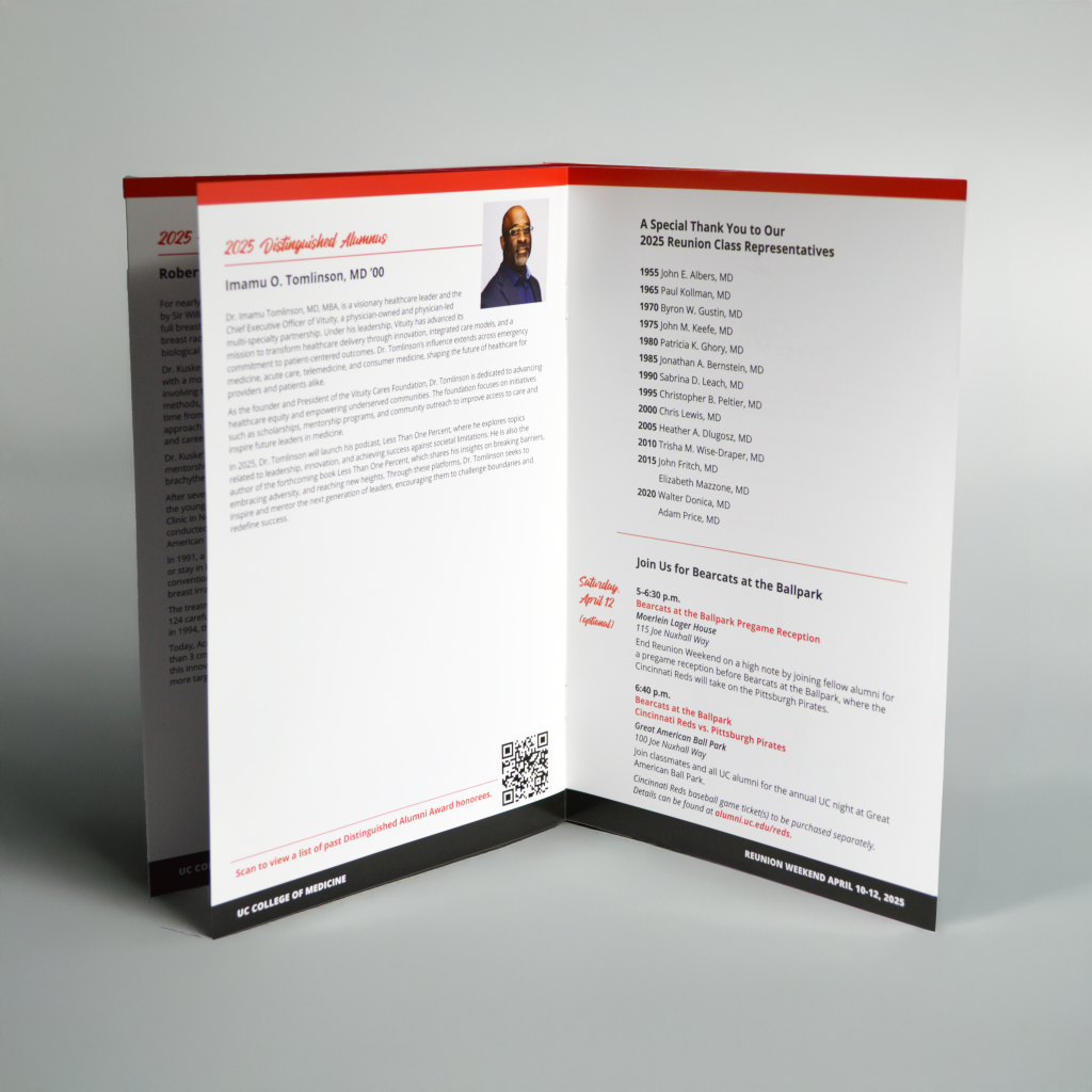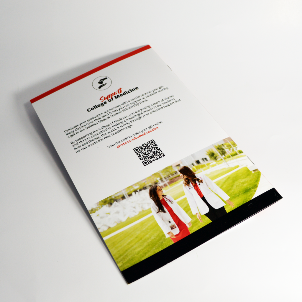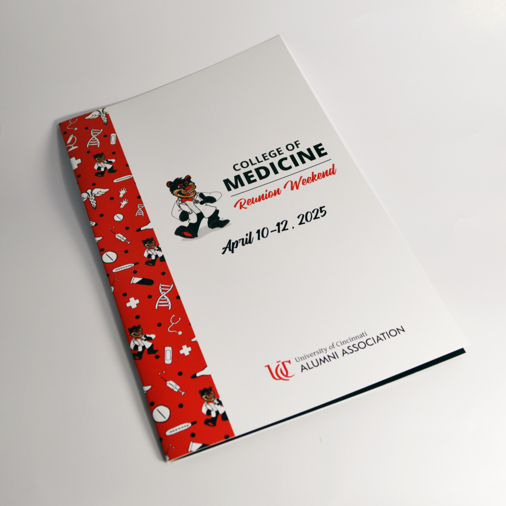 The UC College of Medicine planned a special Reunion Weekend to honor distinguished alumni and reconnect graduates. To support the event with high-quality printed materials, the college needed a professionally printed booklet that reflected the prestige of the celebration. Evolution creative solutions partnered with the organizers to deliver a polished final piece.